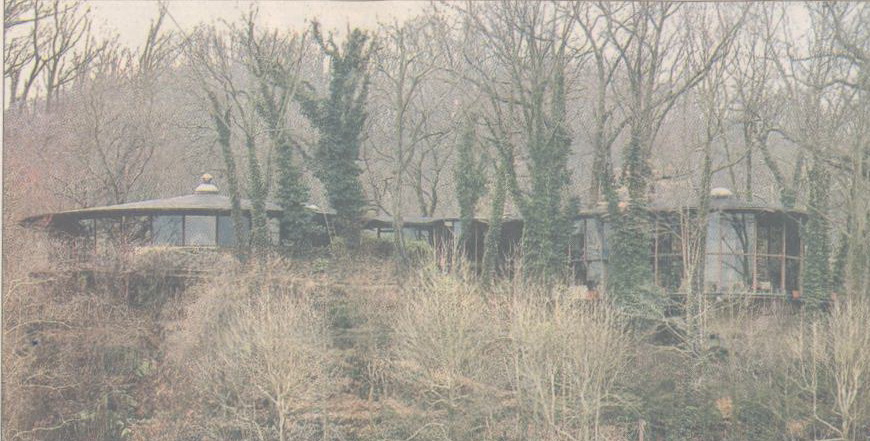TAKING SHAPE is this offbeat, mostly-glass, circular-segmented, pillar-supported structure on a hillside above South Ruffner. Architect Henry Elden designed the combination home and studio for him