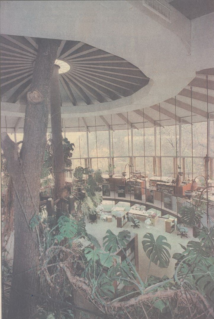 At the center of the atrium is a massive collection of plants that rivals that of any shopping mall. Besides the huge philodendron plants, a tree growing on the site at the time of construction was preserved and became an integral part of the design concept - so much so that